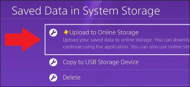 اختر تحميل إلى مساحة التخزين عبر الإنترنت “Upload to Online Storage” (يحتوي هذا الخيار على رمز PlayStation Plus صغير بجواره.