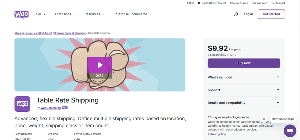 أما بالنسبة لتكلفة إضافة Table Rate Shipping By Woocommerce فتبدأ من 99 دولار أمريكي بترخيص لموقع واحد مع الحصول على ضمان تجربة الإضافة لمدة 30 يوم وللأسف لا توفر الإضافة نسخة مجانية أو نسخة تجريبية تستطيع الاعتماد عليها في تجربة الإضافة أو الاستخدام المحدود لها.