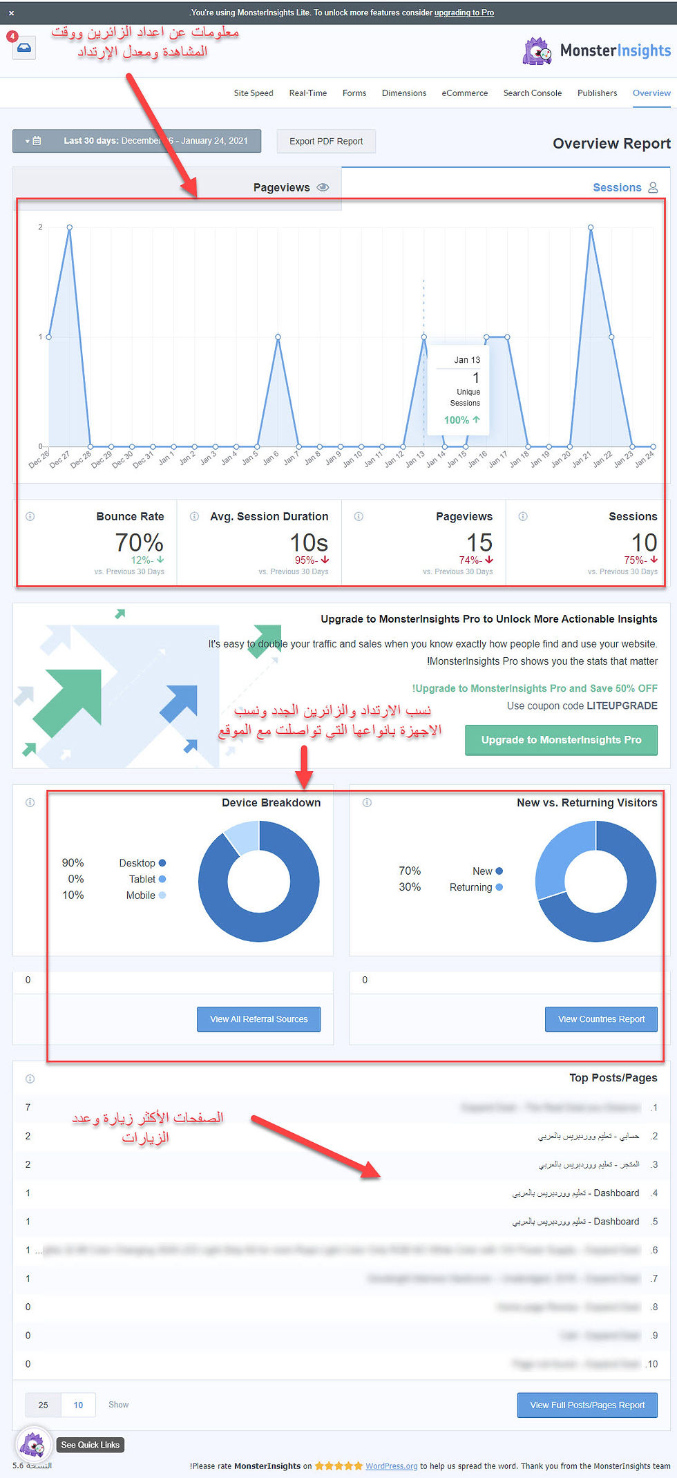 تستعرض الإضافة في الشكل التالي نسب الزيارات والأجهزة والصفحات الأكثر زيارة: