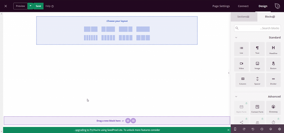 بعد اختيار تخطيط الصفحة، اختر مكونات الصفحة من قسم الكتل أو البلوكات الموجود على يمين النافذة. حيث يحتوي هذا القسم على البلوكات والعناصر الرئيسيّة لبناء الصفحة مثل بلوك إضافة نص، وبلوك إضافة صورة، وبلوك إضافة زر (أما باقي الأدوات فتكون مغلقة لأنّنا نستخدم النسخة المجانيّة في مثالنا).