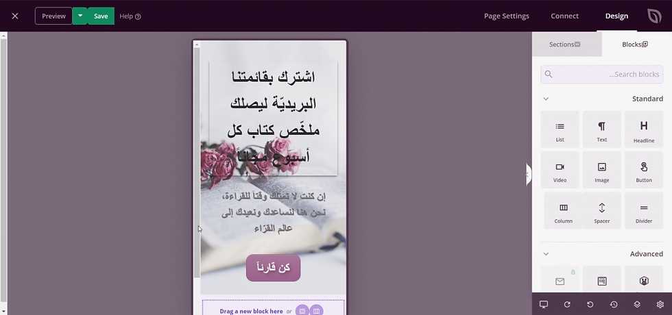 ستظهر لك نافذة بناء الصفحة (Page builder) التي تمكّنك من تصميم وبناء صفحتك كما هو موضّح في الشكل التالي. يوجد أعلى هذه الصفحة ثلاثة تبويبات رئيسيّة، التبويب الأوّل هو Design الذي يتيح لك تصميم الصفحة ويتكوّن من جزأين يضم الجزء الأول على يمين الصفحة عناصر التصميم (Blocks و Sections)، أمّا الجزء الثاني فهو جزء معاينة الصفحة حيث ترى فيه أولًا بأول جميع التغييرات التي تطبّقها على الصفحة.