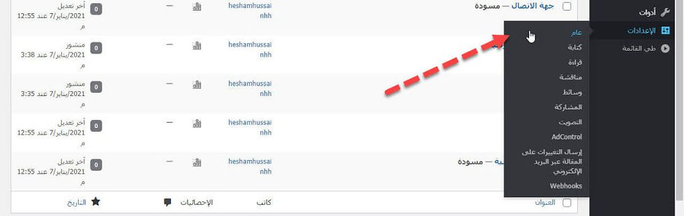 بعد القيام بإنشاء الصفحات والمقالات، علينا معرفة بعض الإعدادات المهمة لإظهار اسم مدونتك ووصفها، وأيضا بعض الإعدادات حتى تظهر المقالات في الصفحة الرئيسية للموقع، ولعمل ذلك اذهب الى إعدادات واختار “عام”.