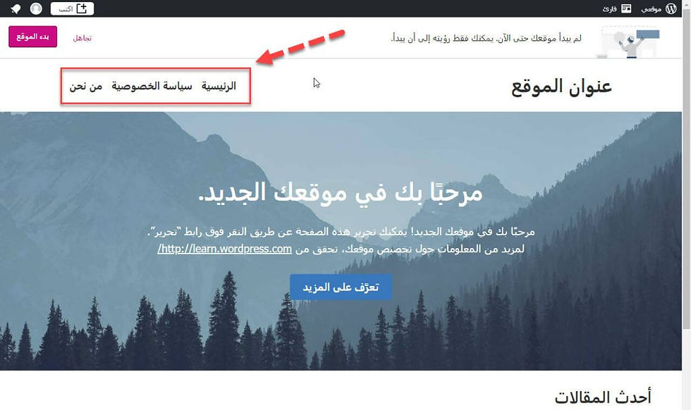 بعد قيامك بحذف الصفحات من القائمة والتي تعبر عن قائمة الموقع الرئيسية في الواجهة الأمامية، اذهب إلى الواجهة الأمامية للموقع ولاحظ إختفاء القائمة القديمة كما بالشكل التالي