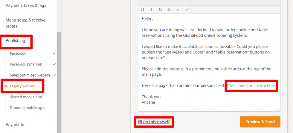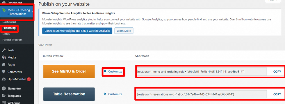 الطريقةالثانية: سنعود إلى الإضافة (Gloria Food) في الشريط الجانبي لموقعك وسننقر على خيار “نشر” (Publishing)، بعدها علينا نسخ الرابط المختصر لكل من القوائم وحجز الطاولات.