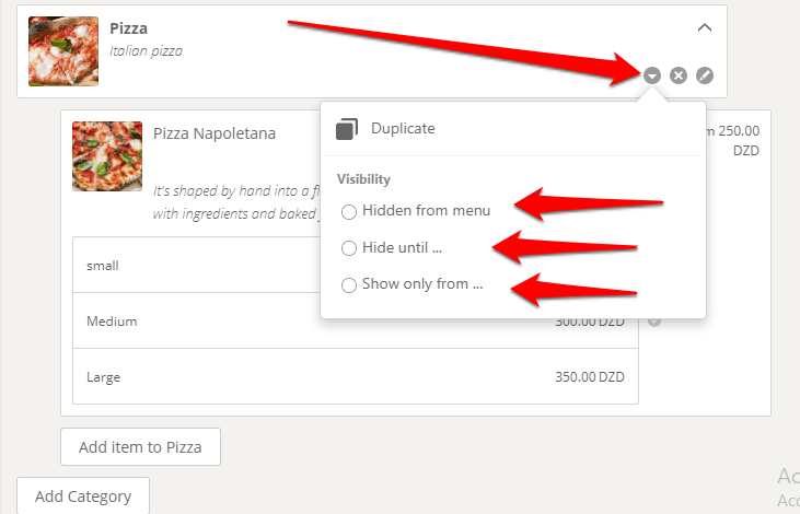 اعدادات اضافية في أصناف المأكولات: هناك بعض الخيارات المميزة الأخرى التي يمكنك استغلالها لتقديم تجربة مستخدم مميزة عبر موقع مطعمك، وهي: