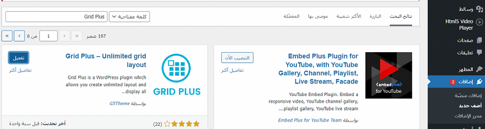 1-انتقل إلى لوحة تحكم موقع ووردبريس الخاص بك واختر إضافات< أضف جديد< واكتب اسم الإضافة Grid Plus في مربع البحث ثم قم بتثبيث وتفعيل الإضافة على موقعك.