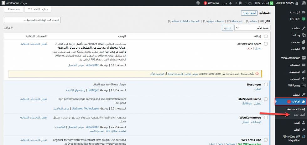 ستجد أن بوابة باي بال مدمجة بشكل تلقائي مع المنصات التعليمية أو المتاجر الإلكترونية وتحتاج إلى التفعيل فقط ولكن إذا لم تجدها يمكن الدخول إلى لوحة الووردبريس الرئيسية وبعد ذلك تضغط على اضافات وتختار منها أضف جديد كما في الصورة التالية: