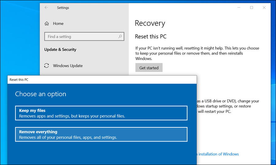 هذا الخيار الأول سوف يتيح لك إعادة ضبط نظام تشغيل ويندوز إلى الإعدادات الافتراضية مع الاحتفاظ ببعض الملفات الشخصية المخزنة على قرص C وعدم المساس بالملفات المخزنة على البارتيشنات الاخرى للهارد، في المقابل يتم حذف جميع التطبيقات والبرامج المثبتة.