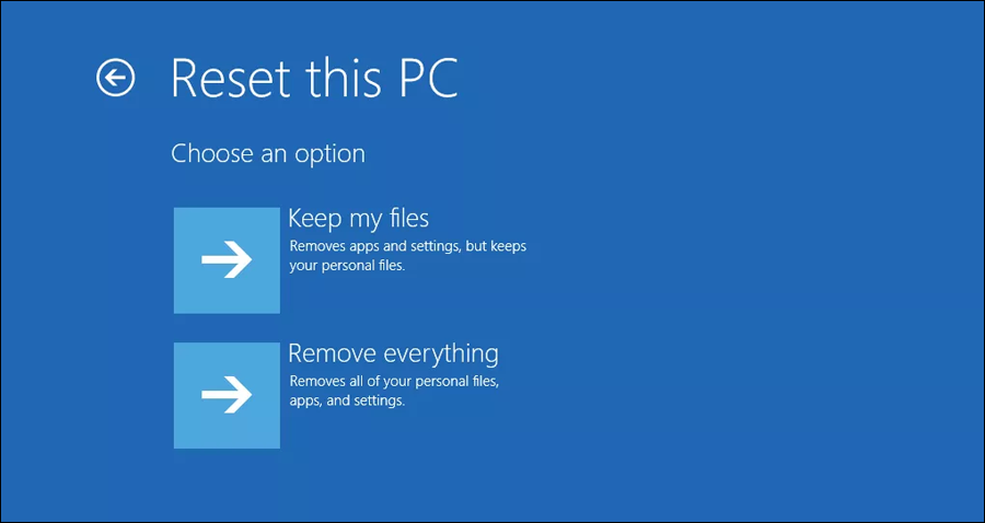 بعد الإنتقال إلى شاشة “System Recovery” (كن حذرا لما سوف تختاره هنا) قم باستخدام مفتاح السهم السفلي على الكيبورد لتحديد خيار “Troubleshoot” واضغط Enter. بعد ذلك قم بتحديد خيار “Reset this PC” واضغط Enter مرة أخرى. الآن سيظهر أمامك خيارين: Keep my files و Remove everything.