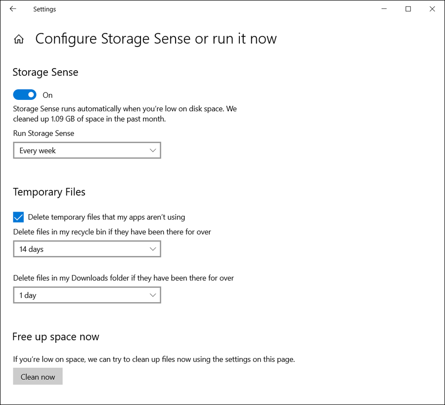 وفي نفس الصفحة، يمكنك أيضًا ضبط الطريقة التي تريد بها حذف الملفات المؤقتة أو إذا كنت تريد حذف الملفات تلقائيًا من مجلد Downloads بعد عدد مُحدد من الأيام. علاوة على ذلك، يمكنك تفعيل خاصية Storage Sense إذا كنت ترغب في أن يقوم النظام بتنظيف الهارد يدويًا من حين لآخر.