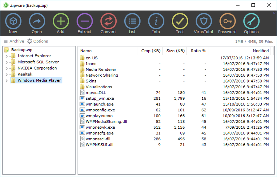 بإستخدام Zipware يمكنك إنشاء ملفات مضغوطة محمية بكلمة مرور قوية يصعب اختراقها، جنبًا إلى جنب، أداء بعض الوظائف المثيرة للإهتمام من خلال قائمة الخيارات الخاصة بأداة File Explorer مثل أرشفة مجموعة من الملفات دفعة واحدة أو تحويل صيغة أي ملف مضغوط إلى 7z أو ZIP، يمكنك حتى فحص أي ملف بواسطة أكثر من 50 برنامج Antivirus عبر VirusTotal.com مباشرًة من Zipware.
