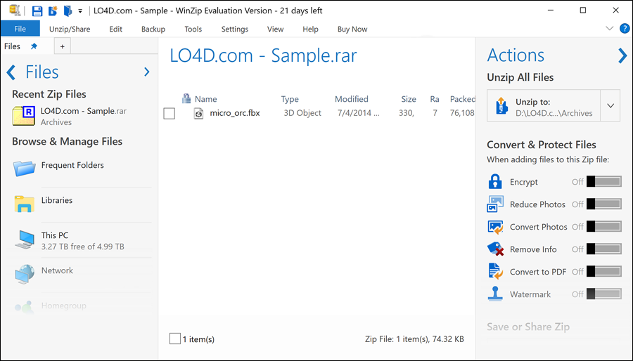 ومن ضمن الصيغ المدعومة في WinZip هي ZIP و RAR و ISO و 7Z و VHD و IMG وغيرها الكثير. البرنامج مجاني لفترة تجريبية قدرها 45 يومًا، بعد ذلك ستضطر إلى دفع 35.34$ مقابل الحصول على الإصدار القياسي إن أردت استمرار استخدامه.