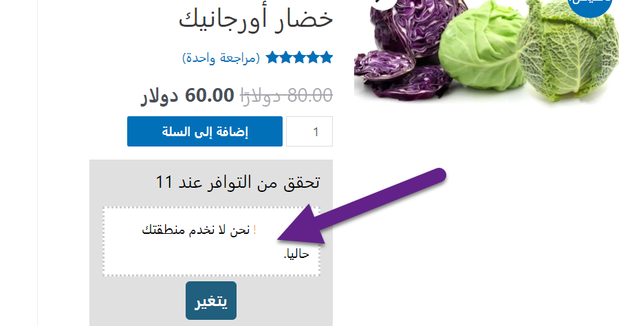 وعند قيام أحد الزوار بكتابة كود بريدي غير مدعوم أو خارج نطاق التوصيل أو الخدمة التي توفرها ستظهر له رسالة تخبره بأن الخدمة ليست متوفرة في المنطقة التابع لها: