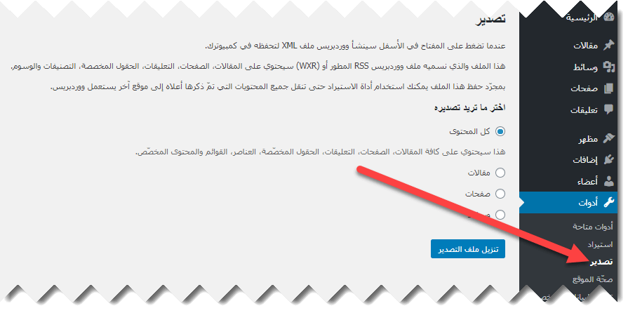 في المقابل يمكنك تصدير بيانات موقعك الحالي؛ والتي تشمل بيانات محتوى موقعك مثل المقالات والصفحات والتصنيفات وغيرها من البيانات داخل موقعك، فيمكنك اختيار نوع المحتوى الذي تريد تصديره والإحتفاظ به أو تقوم باختيار ” كل المحتوى” ليتم تحميل وتصدير المحتوى بالكامل في ملف يمكنك تنزيله والإحتفاظ به أو استخدامه فيما بعد كيفما تشاء: