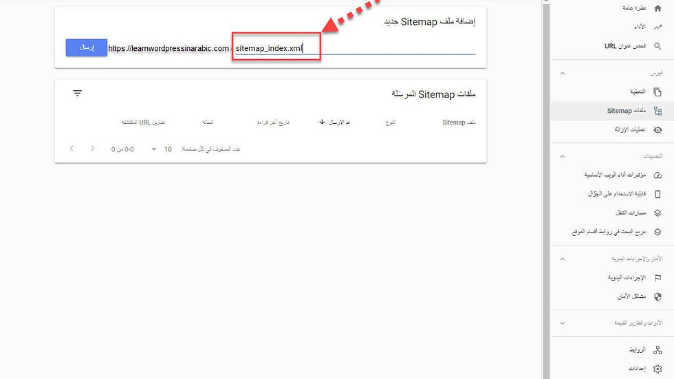اول ما سنقوم باستخدامه من القائمه هو ملفات Sitemap حيث يتم اضافة خريطة الموقع إلى الـ Search Console و يجب أن تكون قد قمت بإعداد تلك الخريطة في موقعك، سواءًا أنشأتها بشكل يدوي أو بإحدى الإضافات، يتم إنشاء رابط الصفحة الخاص بالخريطة على الشكل التالي: