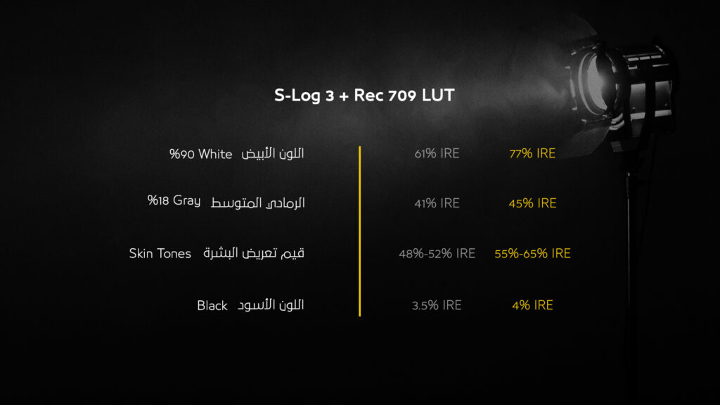 عند إستخدام الـ LUT الذي يحول مادة S-Log 3 إلى مساحة لونية REC.709 في الكاميرا، من المهم أن ندرك أن قيم التعريض في الجدول أعلاه ستختلف وتصبح على الشكل التالي :