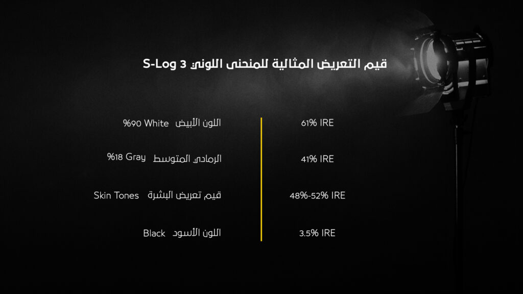 عند التصوير بمنحنى الغاما (المساحة اللونية) S-Log 3، يجب الإنتباه إلى نقطة مهمة جداً، وهي التعريض الصحيح للصورة، وللوصول إلى ذلك التعريض الصحيح، فإننا سنتبع التوصيات التي طرحتها شركة سوني لتعريض اللقطات المصورة بواسطة منحنى الغاما (المساحة اللونية) S-Log 3 على الشكل التالي :