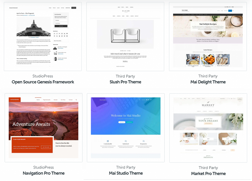 وإذا ألقيت نظرة على القوالب في موقع StudioPress الإلكتروني، فسترى أن هناك الكثير من القوالب كلها فريدة من نوعها ومختلفة في التصميم والتنسيق، لكن مكوناتها الداخلية متشابهة تمامًا، ذلك لأنها تستند إلى نفس القالب الأصلي وتطبق مفهوم الوراثة.