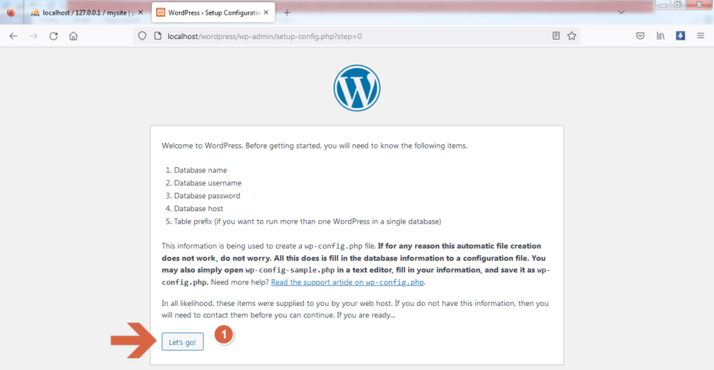 بعد ذلك نضغط على كلمة Let’s go للدخول في صفحة إعدادات قواعد البيانات للووردبريس.