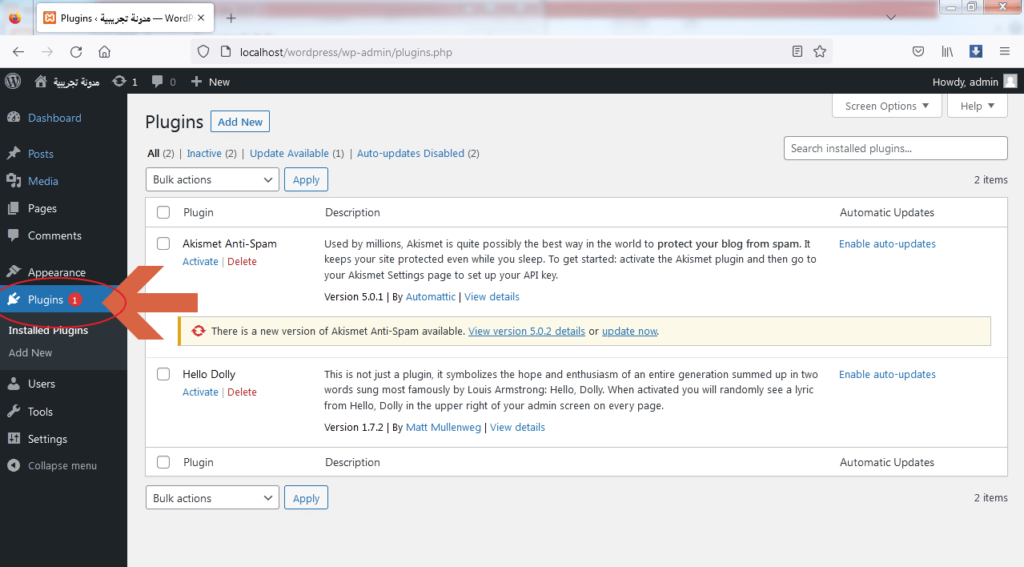 كما يمكنك أيضا تخصيص و تنزيل المزيد من الإضافات والتي تعد نقطة قوة إسكربت الووردبريس من خلال الضغط على كلمة Plugins من القائمة اليسرى كما بالصورة و من ثم الضغط على Add new من الأعلى لتنزيل أي إضافة جديدة.