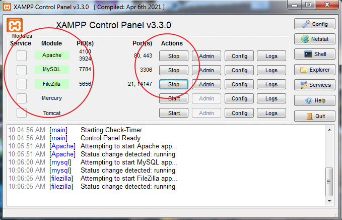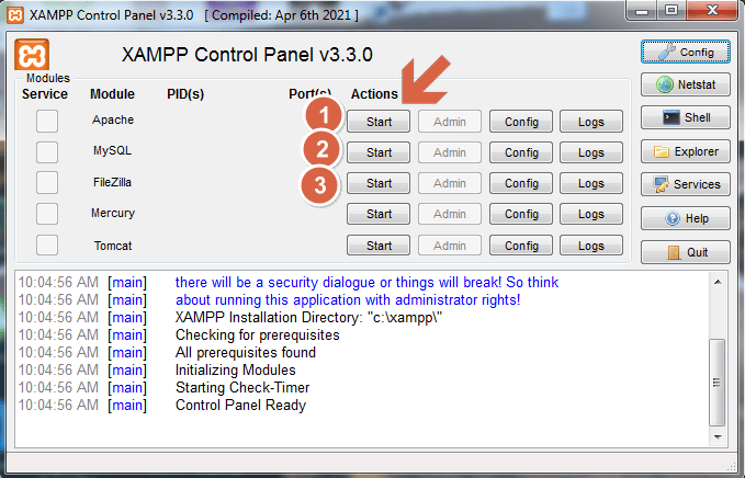 الان البرنامج يقدم لنا ثلاثة خدمات رئيسية و التي يعتمد عليها تشغيل سكربت الووردبريس أو أي إسكربت php عموما و هي Apache و Mysql و أيضا FileZilla الخاصة برفع الملفات إلى السيرفر المحلي .