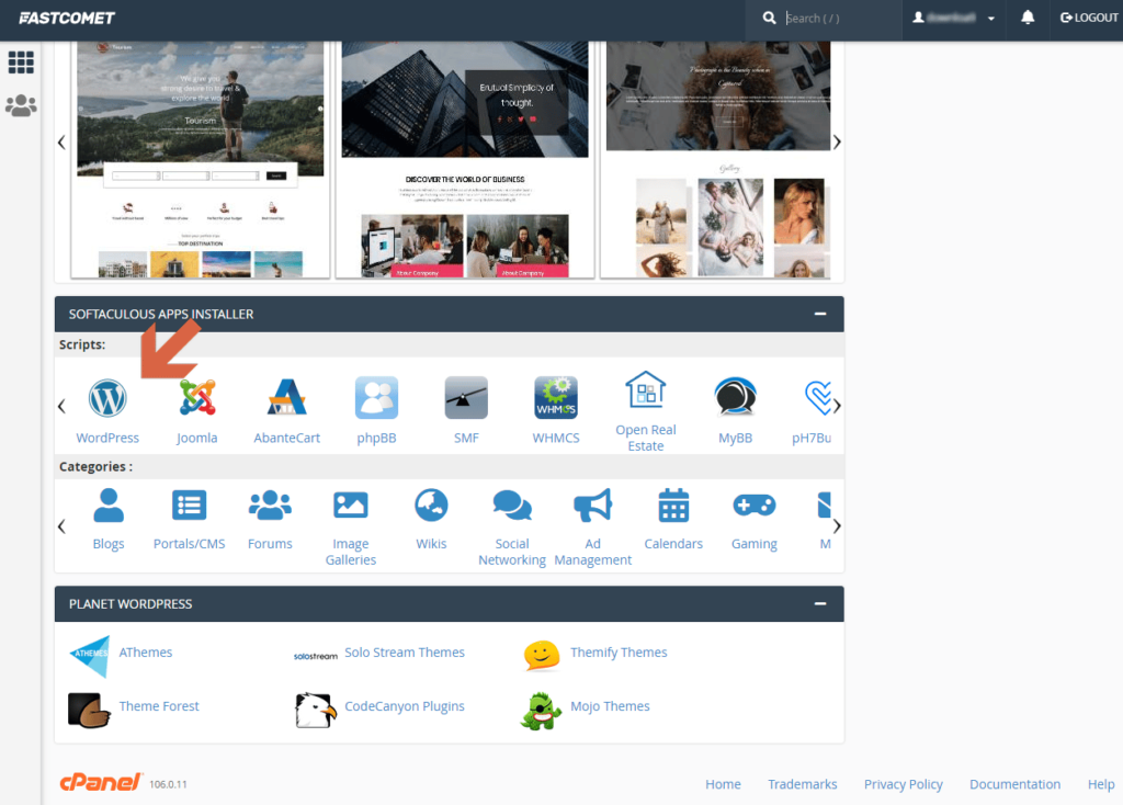 دعنا أولا نبدأ بالطريقة الأسهل و الأسرع بالنسبة لأي مستخدم و هي طريقة التنزيل الأوتوماتيكية عبر لوحة السي بانل عن طريق النزول إلى أسفل صفحة التحكم و البحث عن كلمة WordPress و نجدها كما بالصورة.