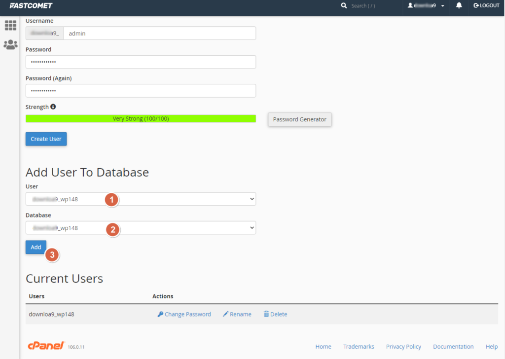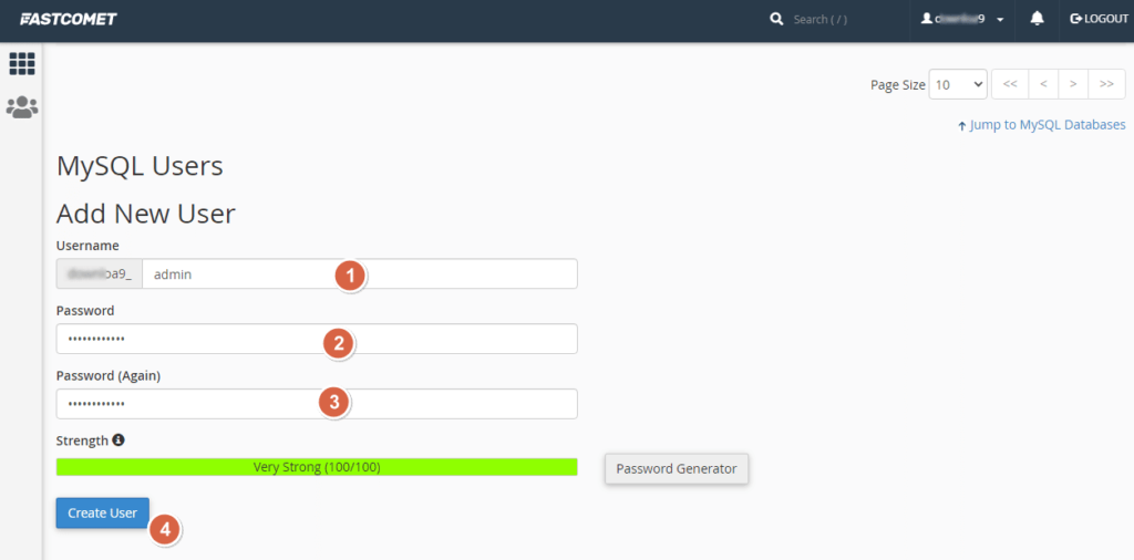 الخانة رقم 2 و 3 : نقوم بكتابة باسورد أدمن قاعدة البيانات و إعادة الباسورد مرة أخرى في الخانة رقم 3 و من ثم نقوم بالضغط على كلمة Create User .