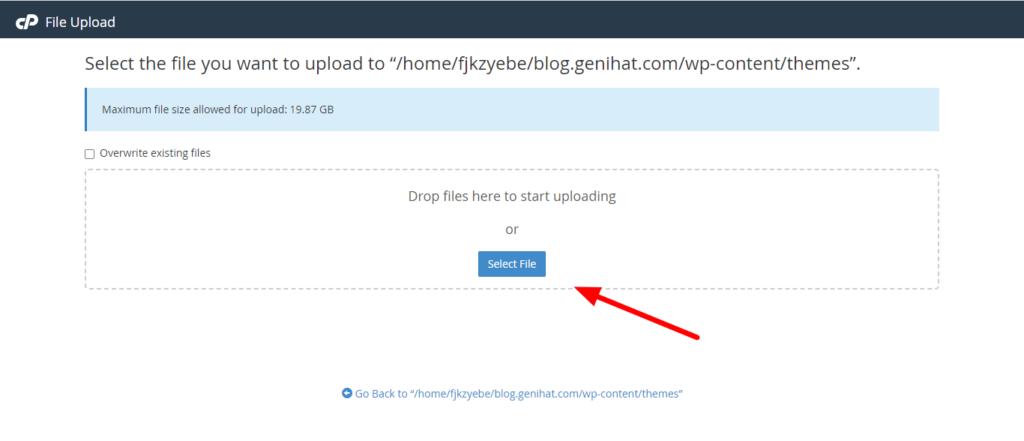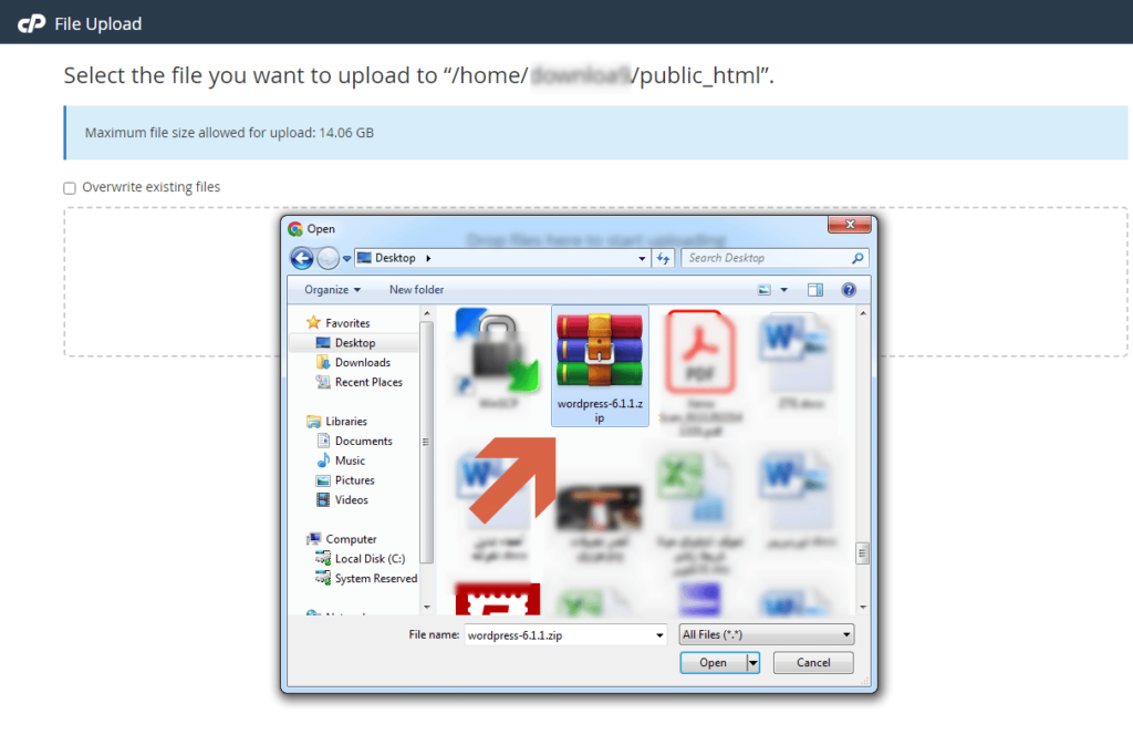 نقوم بعدها بالضغط على كلمة Upload لرفع الملف المضغوط الخاص بالبووردبريس و الذي قمنا بتحميله من الموقع الرسمي مسبقا في الخطوات السابقة.