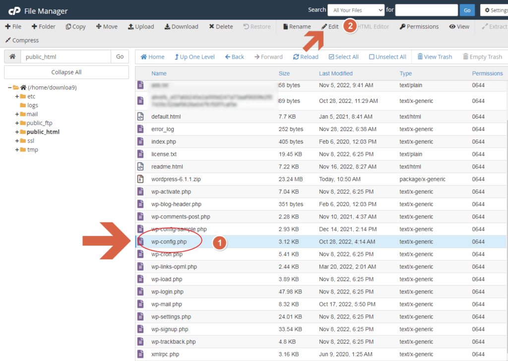 بعد فك الضغط عن الملفات سوف تلاحظ ظهور ملفات كتيرة بمجلد Public_html نقوم بتحديد ملف wp-config.php و هو المسؤول عن إعدادات الووردبريس الأساسية و نقوم بالضغط على كلمة Edit او تحرير من أعلى الشاشة كما بالصورة التالية.