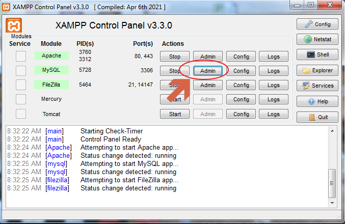 أولا نقوم بالضغط على كلمة admin الموجودة بجانب خدمة Mysql كما بالصورة.