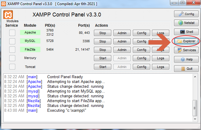 الخطوة التالية هي تنزيل ملفات الووردبريس على السيرفر المحلي لذلك نرجع إلى برنامج XAMPP و من ثم نقوم بالضغط على كلمة Explorer كما بالصورة التالية لفتح مدير الملفات على السيرفر.