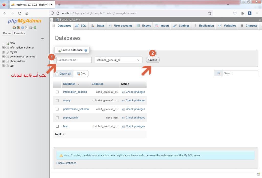 في الخانة رقم 1 : نقوم بكتابة أسم قاعدة البيانات ( متاح لك إختيار أي أسم تريده بحرية تامة ) و من ثم نقوم بالضغط على زر Create أو إنشاء لإنشاء قاعدة البيانات الجديدة .