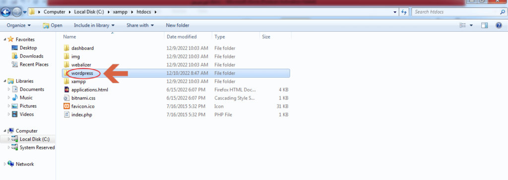 بعد فتح مجلد htdocs نقوم بإنشاء مجلد جديد و نقوم بتسميته wordpress مثلا أو أي إسم تفضله حيث أنه سوف يكون هو مسار إسكربت الووردبريس عند كتابته يقوم بتوجيهك للصفحة الرئيسية لموقع الووردبريس الخاص بك.