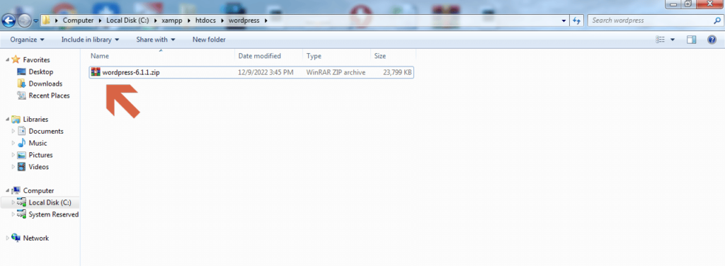 نقوم الان بأخذ الملف المضغوط الخاص بنسخة الووردبريس التي تم تحميلها من الموقع الرسمي و نقوم بنقلها إلى داخل مجلد wordpress الذي قمنا بإنشاءه في الخطوة السابقة.