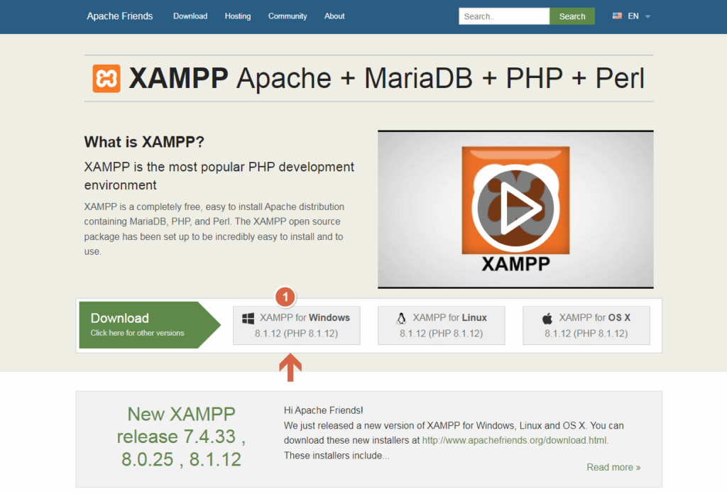 يجب أولا الذهاب إلى هذا الرابط لتحميل برنامج السيرفر المحلي بحجم تقريبا 150 ميجابايت، في الصفحة الرئيسية للبرنامج نقوم بالضغط على كلمة XAMPP for windows كما هو موضح بالصورة.