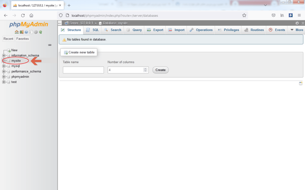 بعد الإنشاء سوف نلاحظ ظهور أسم قاعدة البيانات التي قمنا بإنشائها بالعمود الأيسر في الصفحة الرئيسية كما بالصورة.
