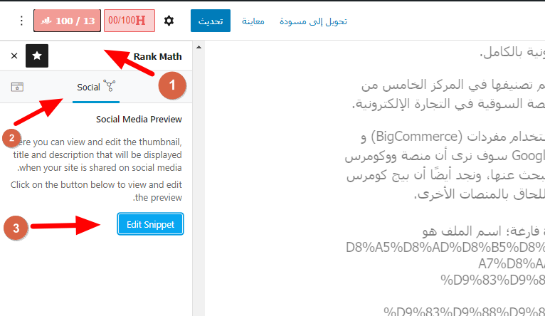 بنفس الطريقة، ستحتاج لفتح المقال أو الصفحة التي بها الخطأ، ومن ثم اذهب إلى على أيقونة رانك ماث في أعلى الصفحة المحددة واذهب إلى تبويبة: social > Edit Snippet