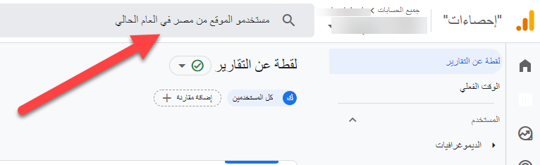 من أكثر المميزات الممتعة في استخدام الإصدار الجديد من الإحصائيات هو شريط البحث الذكي داخل التقارير، والذي يمكنك استخدامه بطريقة مباشرة للحصول على بيانات تقوم أنت بإدخالها لها، مثل ( مستخدمو الموقع من مصر خلال العام الحالي):