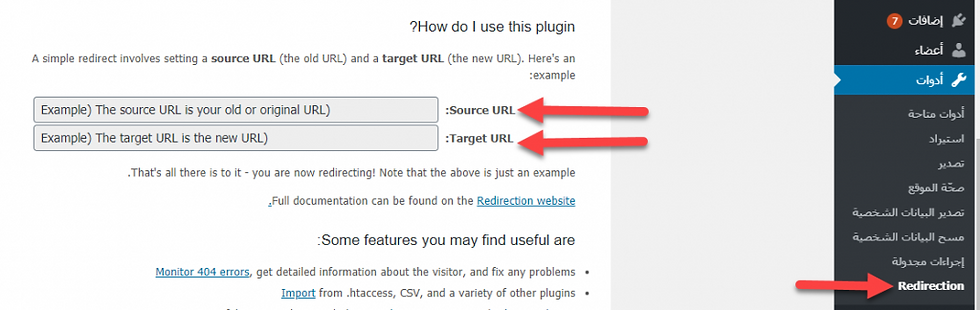 بعد تنصيب الإضافة وتنشيطها على الموقع، يمكنك الدخول إلى لوحة تحكم الووردبريس ثم الذهاب إلى: الأدوات << Redirection