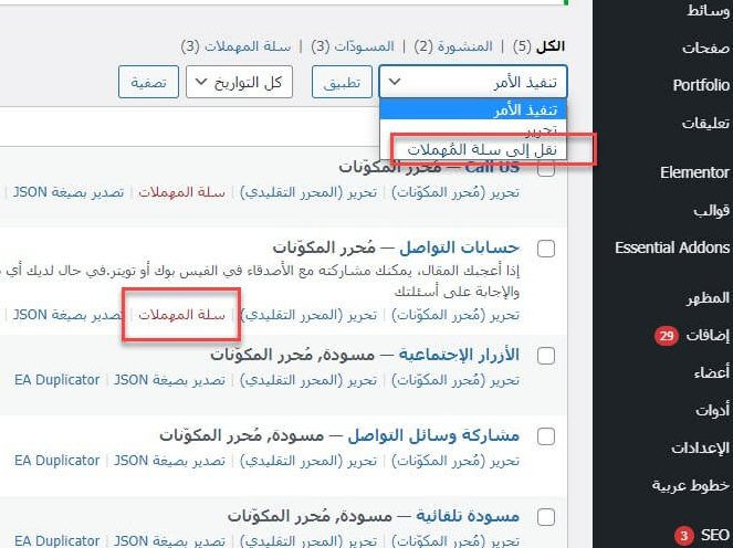 لحذف مكوّن بشكل نهائي، يمكنك الضغط على سلة المهملات أو تحديد العنصر والضغط على نقل لسلة المهملات