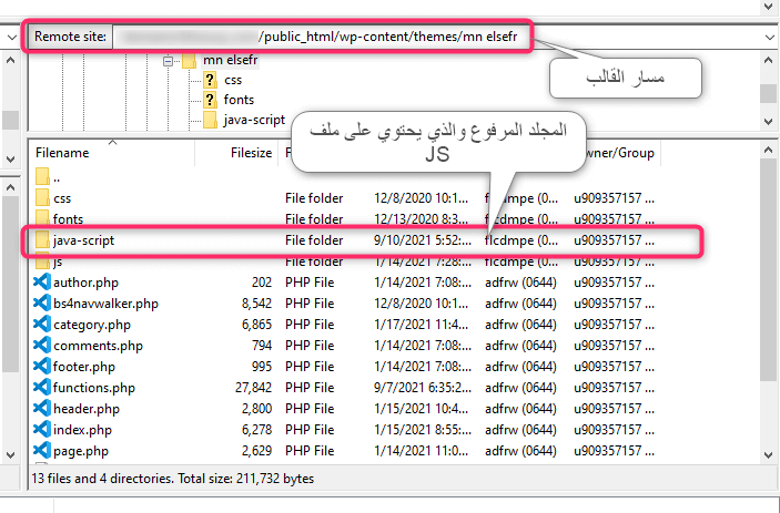 3-بواسطة أحد برامج عميل FTP إذهب إلى مسار القالب النشط وارفع الملف بداخله كما توضح الصورة بالأسفل: