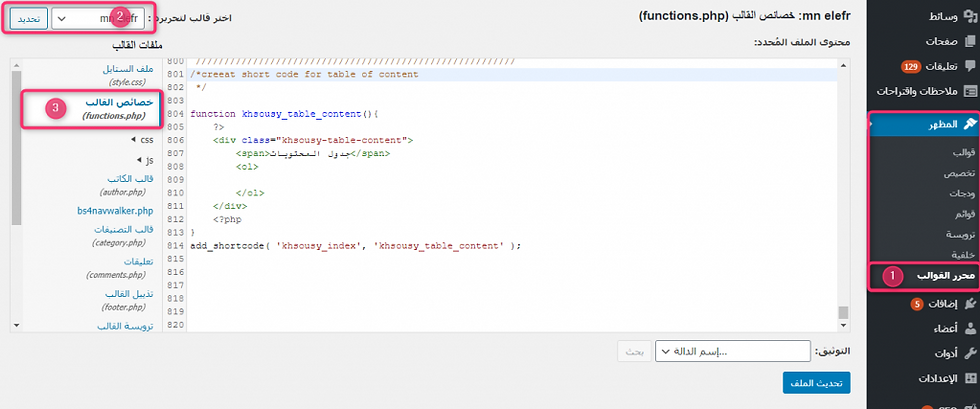 ?> عد وضع الكود السابق في نهاية ملف functions.php قم بحفظ الملف بالنقر على زر تحديث الملف كما توضح الصورة التالية: