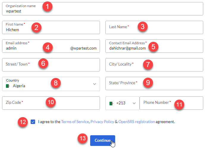 أ/ أنّ عنوانك واسم النّطاق الّذي اخترته سيجري مشاركتهما مع موقع تسجيل النّطاقات الأصليّ.