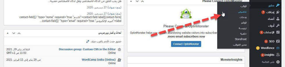 للبدء في إعداد القالب و تخصيصه إذهب إلى القائمة الرئيسية واختر تخصيص المنسدلة من القائمة الفرعية لمظهر