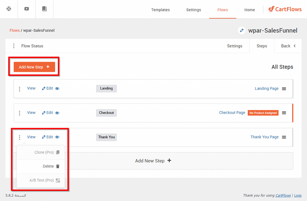 يمكنك أيضاً الضغط على زر إضافة خطوة جديدة (Add New Step) لإضافة صفحات أخرى إلى قمع المبيعات.