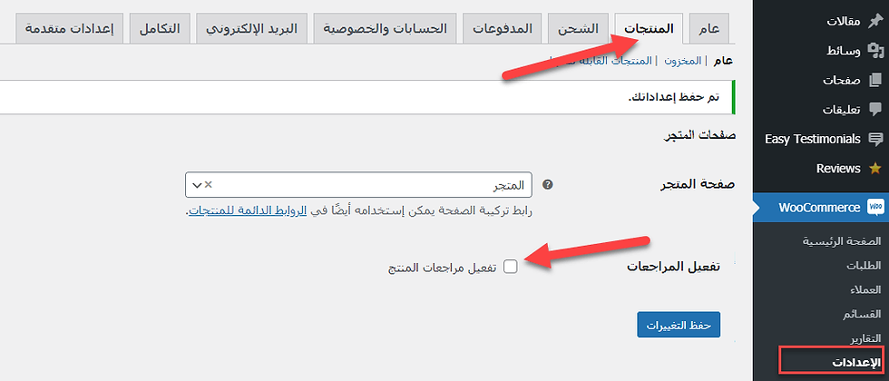 الطريقة الأولى لتفعيل نظام التقييمات داخل متاجر الووردبريس التي تعمل باستخدام إضافة Woocommerce لإنشاء المتجر الإلكتروني هي عبر الدخول الى اعدادات الـ ووكومرس والذهاب إلى إعدادات المنتجات، ثم تفعيل الخيار الخاص بإتاحة التقييمات أمام الزوار والعملاء، كما في الصورة التالية.