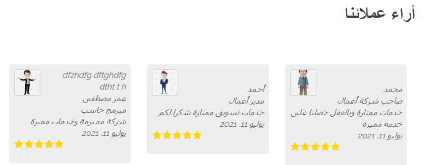 إنشاء صفحة آراء العملاء أمر بسيط للغاية ولا يحتاج إلى أي تعقيدات برمجية أو خبرات سابقة، والصورة التالية توضح مثالان لصفحة “آراء عملائنا”.