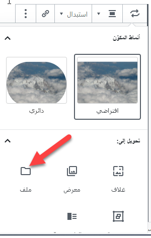 1. إدراج ملف صور قابل للتحميل من زوار الموقع يمكنك وضع الصورة بعد تحميلها داخل موقعك على أنها ملف قابل للتحميل من قبل الزوار، وذلك بالضغط على ” ملف” من داخل نافذة تحرير الصورة :
