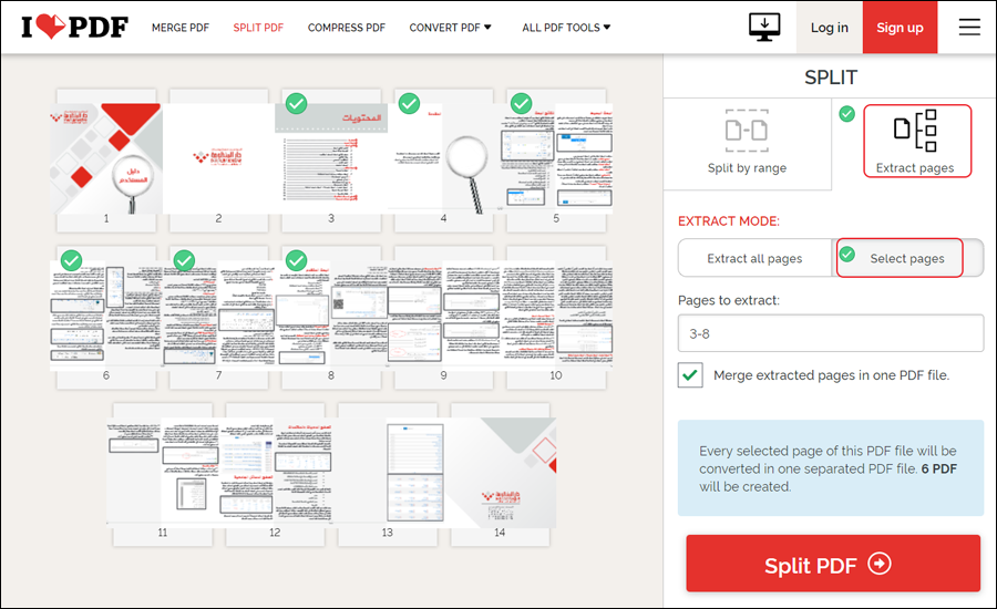 بدلًا من ذلك، يمكنك تحديد الصفحات التي تريد استخراجها، والضغط على Split PDF لمعالجة الأمر والحصول على رابط مباشر لتحميل ملف الـ PDF الذي يحوي الصفحات المحددة.