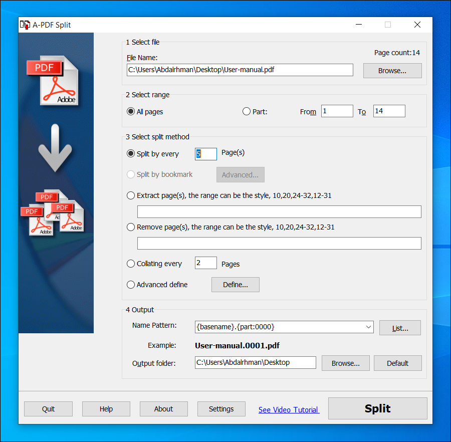 البرنامج يتمتع بواجهة مستخدم بسيطة وسهلة جدًا. فبعد تثبيته وتشغيله على جهازك، اضغط على زر Browse لتحديد مستند الـ PDF. ثم حدد من خلال خيارات Select split method الطريقة التي تريد تقسيم صفحات المستند بها. يمكنك إختيار فصل كل عدد معين من الصفحات في ملف PDF منفصل، أو تقسيمه بعد صفحات متعددة. إذا كانت هناك إشارات مرجعية مضمّنة، فيمكنك تقسيم الـ PDF على تلك أيضًا. تستطيع من خلال البرنامج كذلك استخراج صفحات معينة لفصلها عن الملف الأصلي، أو يمكنك اختيار الصفحات التي تريد إزالتها.